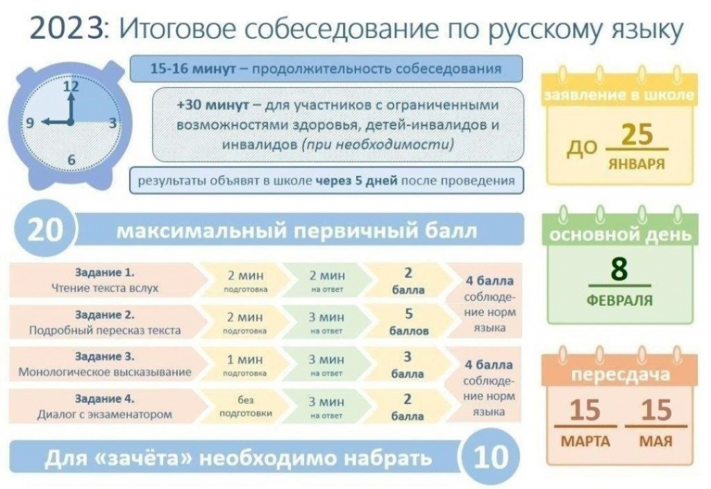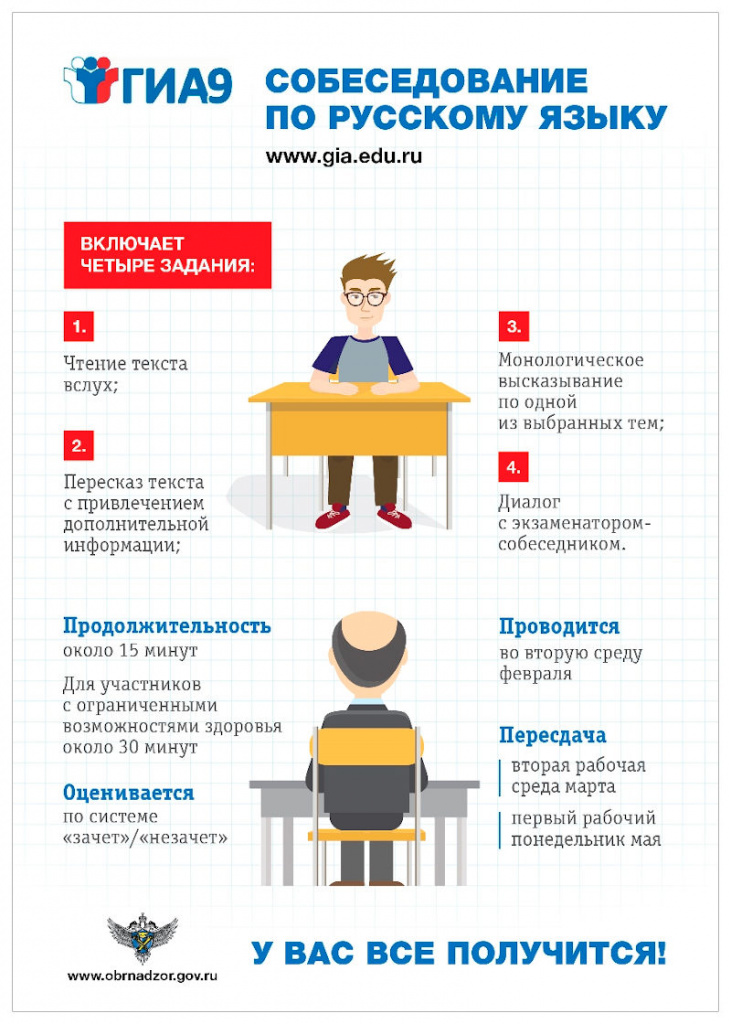 - Для допуска к ОГЭ обучающийся должен получить зачёт по итоговому собеседованию по русскому языку, которое проводится во вторую среду февраля и в дополнительные дни.